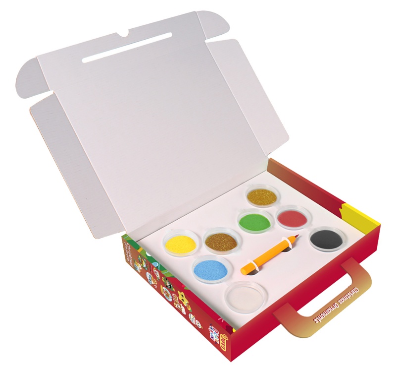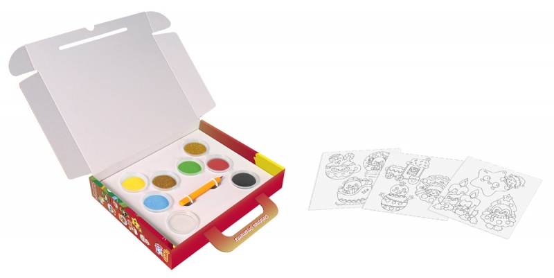kolorowy zestaw do malowania piaskiem w poręcznej walizce zawierający 8 słoiczków z piaskiem w różnych kolorach, rysik oraz 9 świątecznych postaci