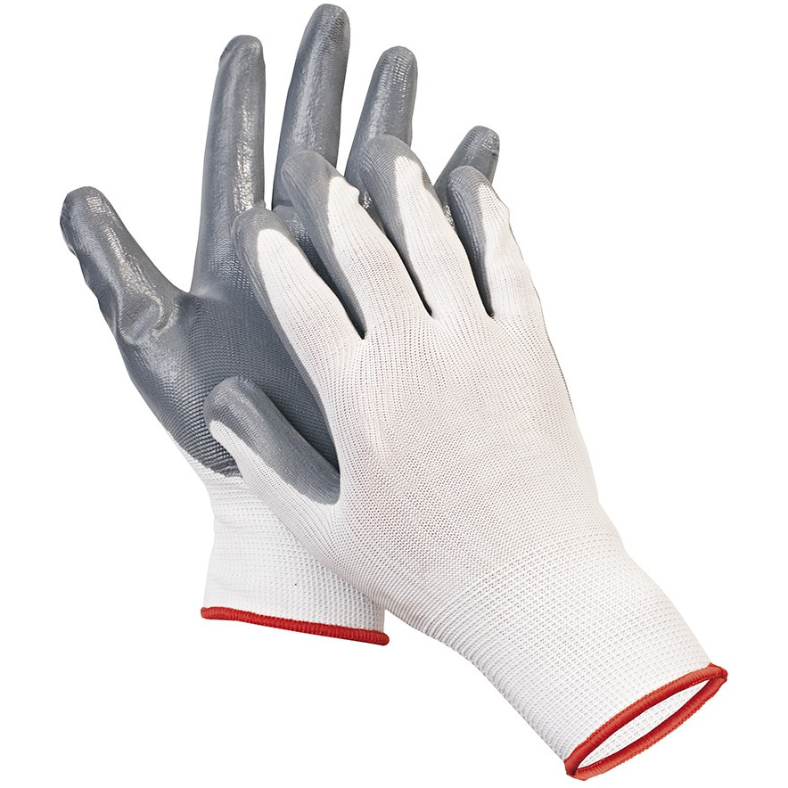 bezszwowe rękawice montażowe, zgodne z normą EN420 wyściółka poliestrowa powlekane warstwą nitrylu w części chwytnej dłoni elastyczny ściągacz w nadgarstku do lekkich prac montażowych w środowisku suchym i lekko zaolejonym odporność mechaniczna zgodnie z normą EN388: 3131 wyściółka biała, powleczenie szare kategoria: II rozmiar: 10