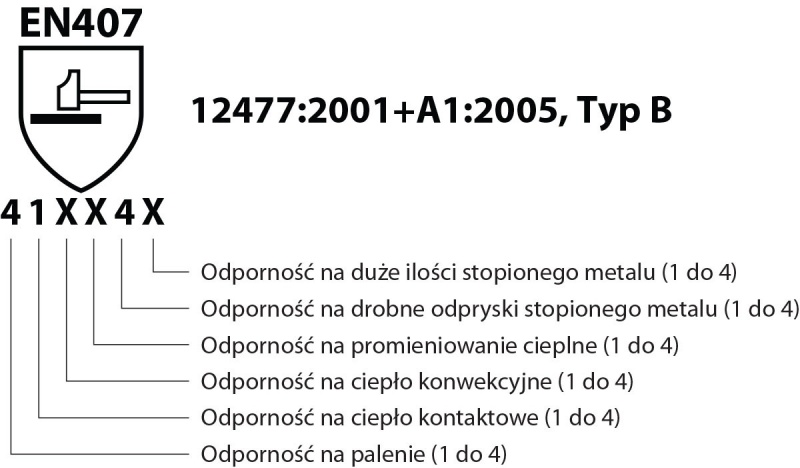 zgodność z normami EN 388:2016+A1:2018 (3121X), EN 407:2004 (41XX4X), EN ISO 21420:2020, EN 12477:2001+A1:2005, Typ B