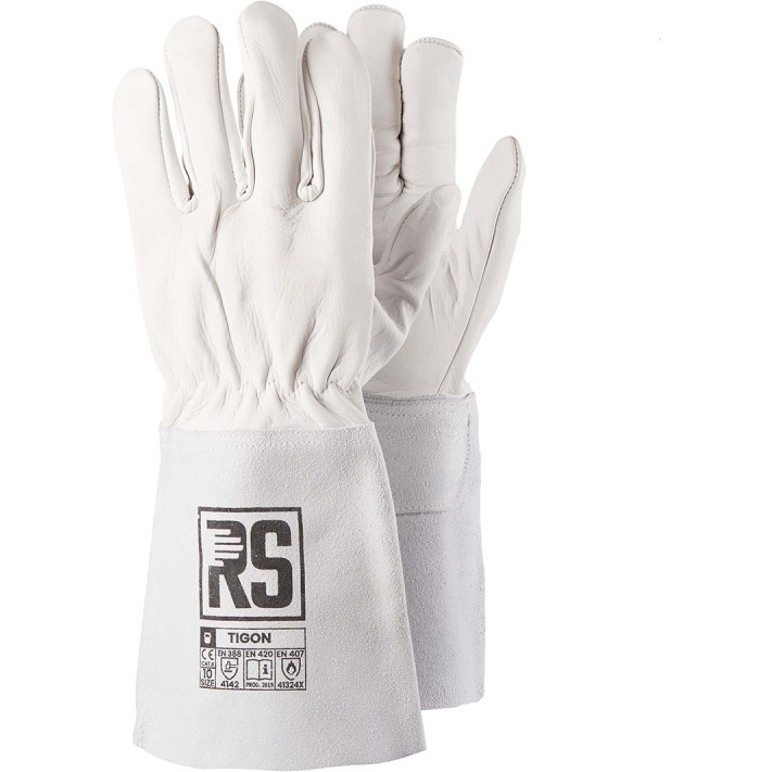 RS TIGON przeznaczona do spawania TIG, uszyta ze skóry licowej bydlęcej, mankiet wzmocniony skórą dwoinową, szwy podwójnie impregnowane, umożliwia precyzję chwytu lancy, zwiększona wytrzymałość szyta nicią bawełnianą EN388 3243X EN 407:2004 422X4X rozmiar: 10 kolor: biały