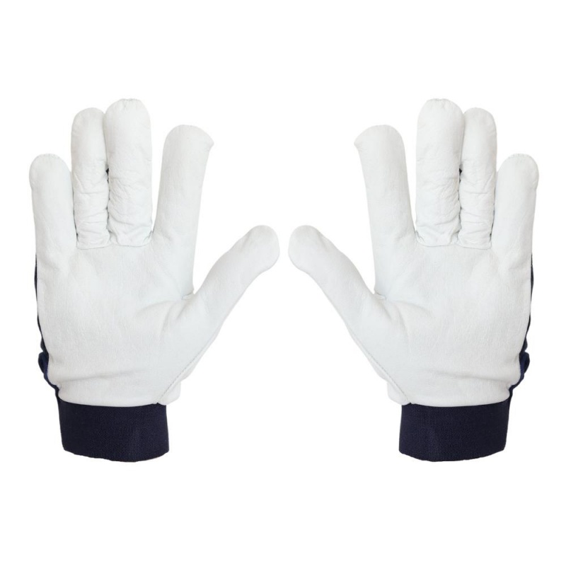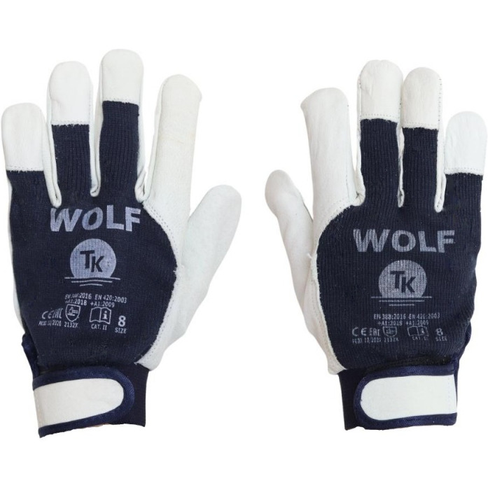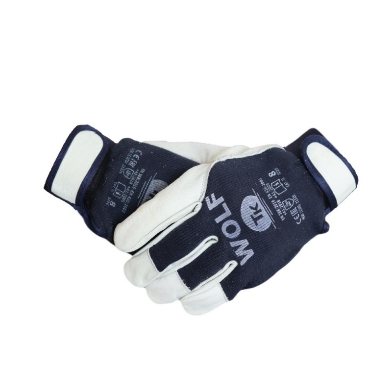 WOLF ? monterska rękawica ochronna wykonana ze skóry koziej jest standardowym wyposażeniem warsztatów ślusarskich. materiał strony wierzchniej: dzianina bawełniana w kolorze granatowym, materiał dłoni: skóra licowa kozia, zapięcie na rzep umożliwia regulację obwodu i utrzymanie rękawicy w niezmiennej pozycji na dłoni. kciuk w całości ze skóry, do prac ogólnych, monterskich oraz lekkich normy: EN 420:2003+A1:2009, EN 388:2016 (2132X)