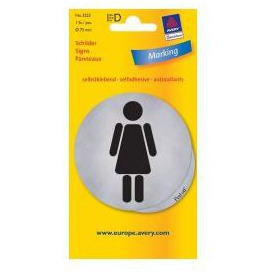 Nalepka metaliczna WC Damski. Symbol samoprzylepny - toaleta damska. Średnica 75 mm. Wykonane z grubej samoprzylepnej metalowej folii.