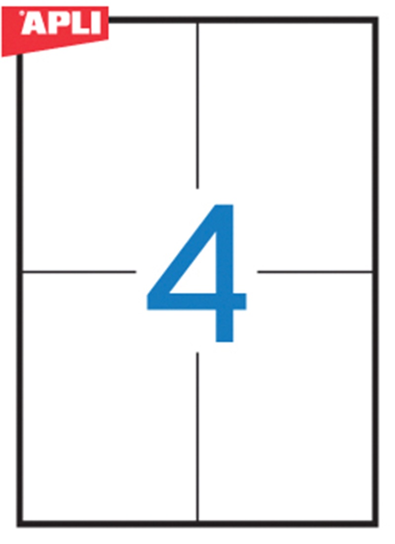 uniwersalne etykiety samoprzylepne do drukarek atramentowych, laserowych i kserokopiarek specjalna formuła kleju nie ulega rozpuszczeniu przy wysokich temperaturach, dzięki czemu nie wycieka i nie odkłada się na mechanizmie drukarki rozmiar etykiety: 105x148mm liczba etykiet na arkuszu: 4 gramatura: 143gsm (papier matowy) białość: 162 CIE rozmiary etykiet zgodne z najbardziej popularnymi programami komputerowymi nowy System Express Mailing, pozwala na łatwiejsze odklejenie etykiety od arkusza! Dodatkowo nowe opakowanie ułatwia dostęp do poszczególnych arkuszy etykiet (dotyczy wybranych modeli) posiadają certyfikat FSC, który gwarantuje, że papier pochodzi z ekologicznie zarządzanych obszarów leśnych darmowy program do projektowania i wydruku etykiet APLI SOFT kompatybilny również z oprogramowaniem Windows 7 dostępny na apli.com lub pbspolska.eu 100 arkuszy w j.s. kolor biały