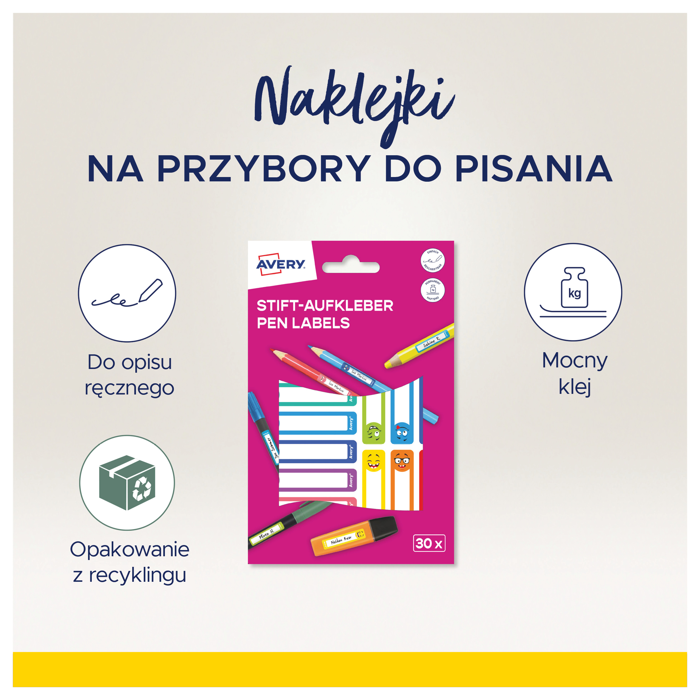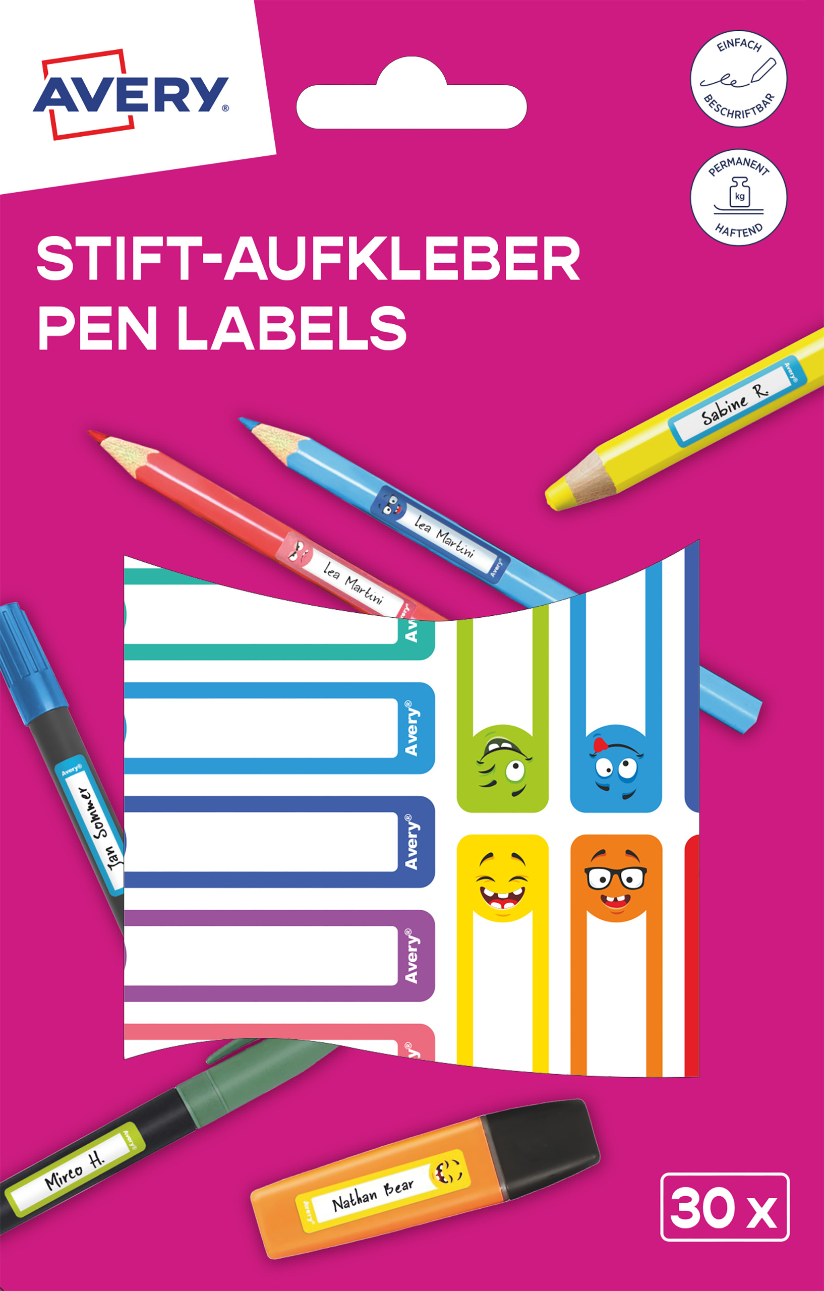 Naklejki na przybory do pisania; 50 x 10 mm , 30 naklejek.; kolorowe buźki, AVERY RESMI30S