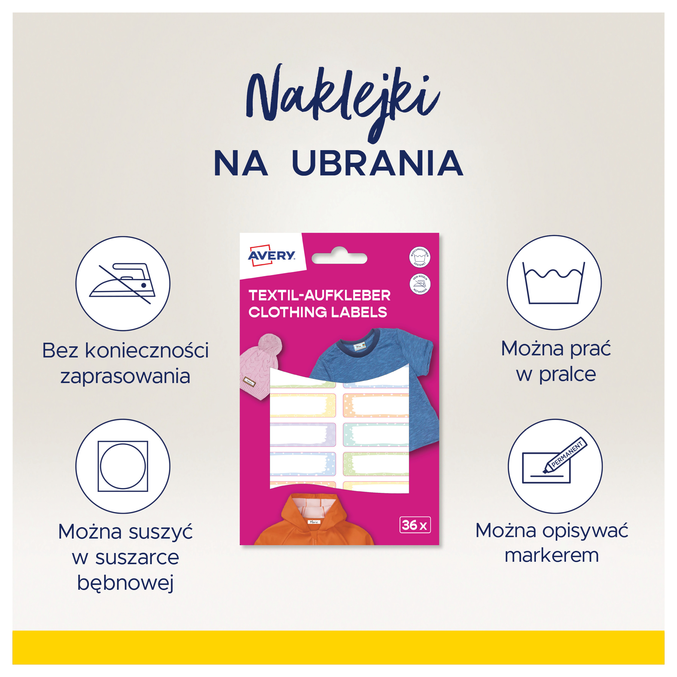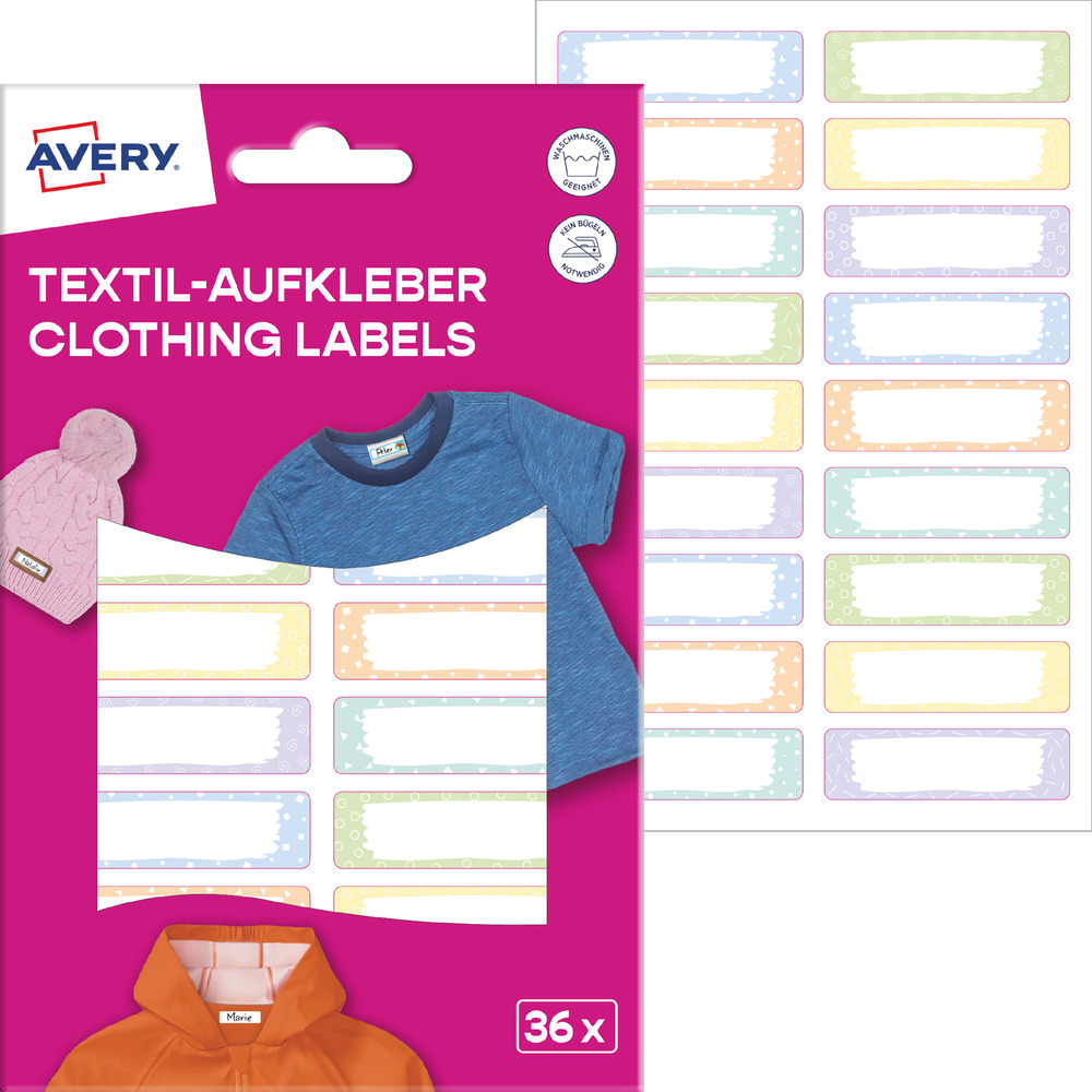 Naklejki na ubrania; 46 x 13 mm, 2 ark/36 naklejek, pastelowe, AVERY ETVET36M