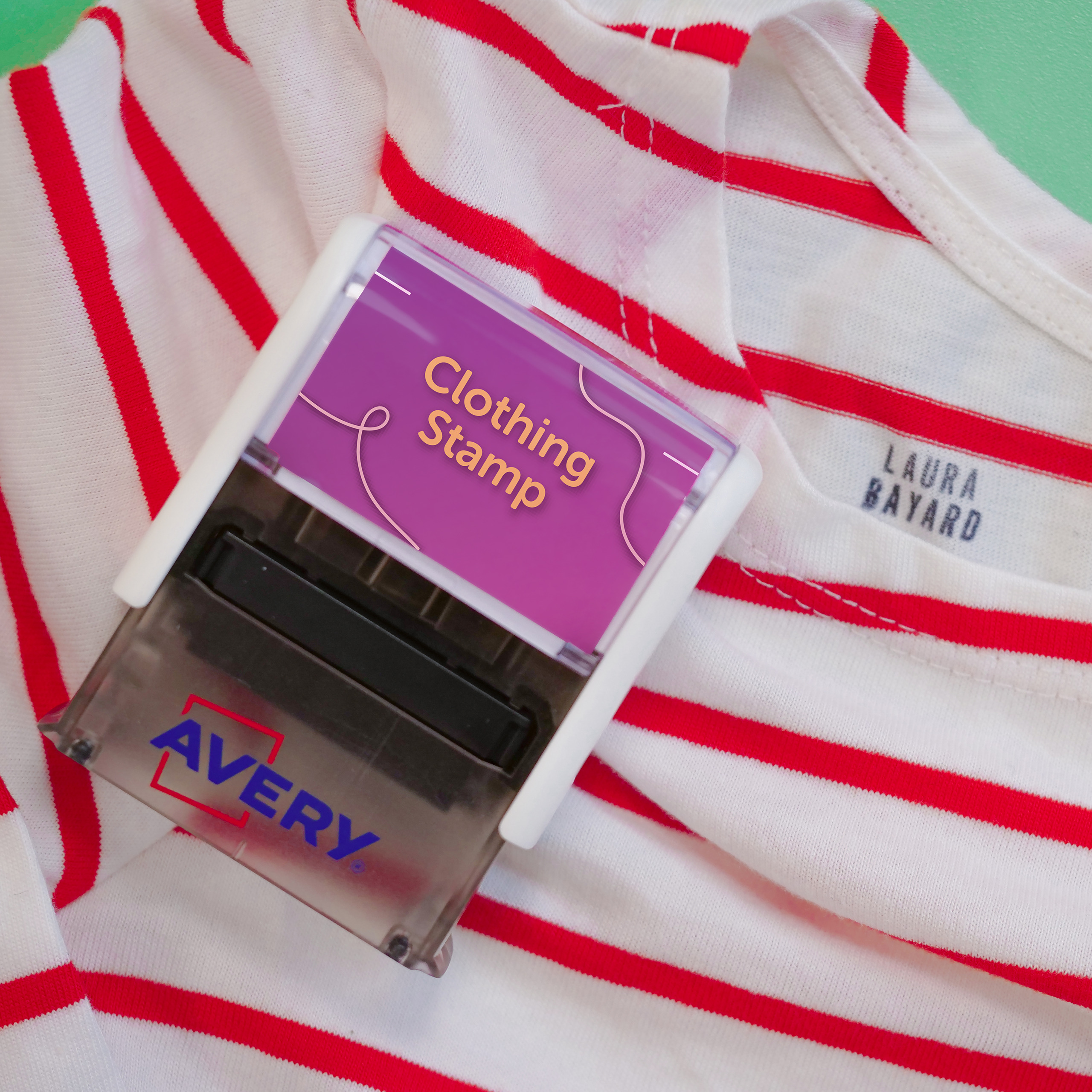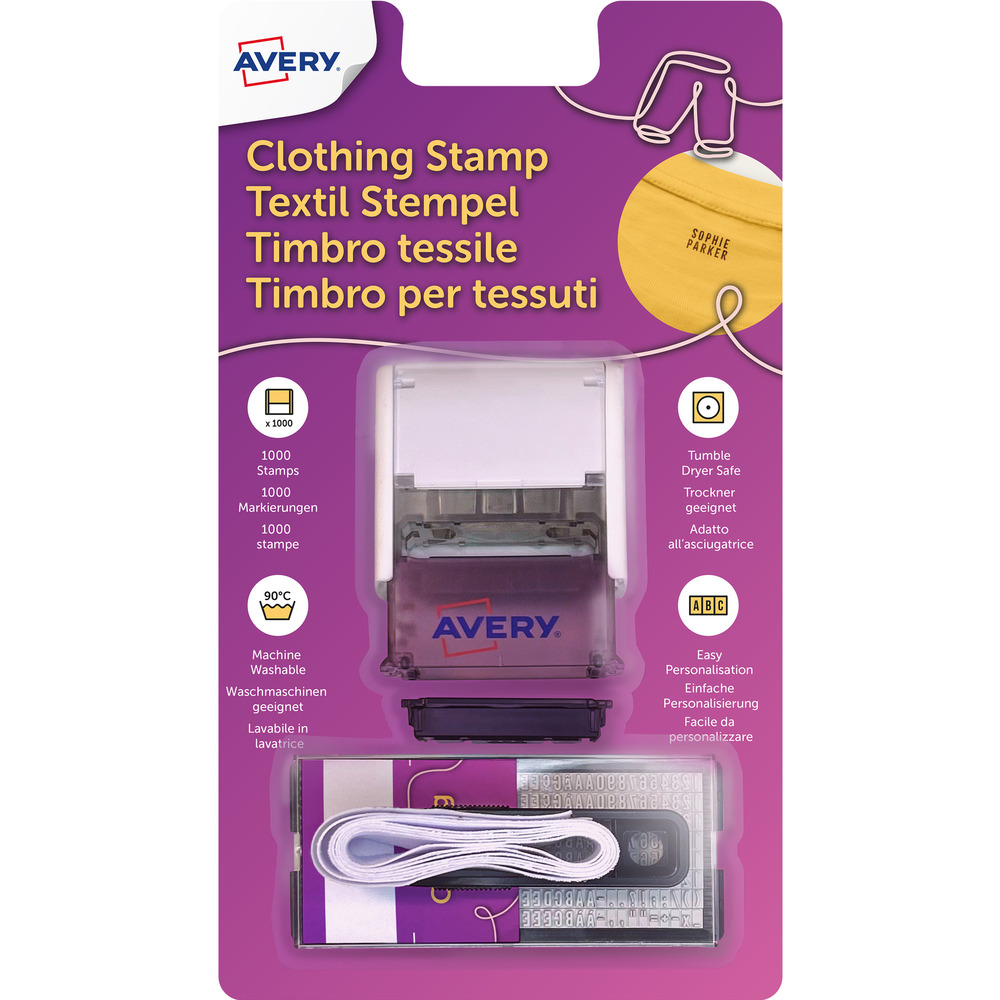 Pieczątka na ubrania, czarny tusz, 288 znaków, 1 pęseta + 1 m białej wstążki do naprasowania (dla ciemnych tkanin), AVERY