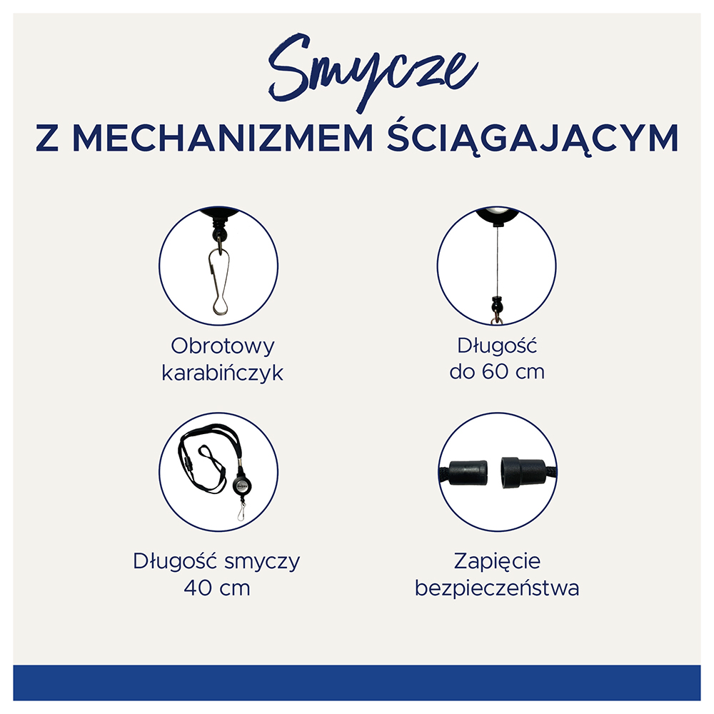 ? Smycze posiadają zapięcie bezpieczeństwa i obrotowy karabińczyk do zaczepienia kart identyfikacyjnych lub uchwytów na identyfikatory.