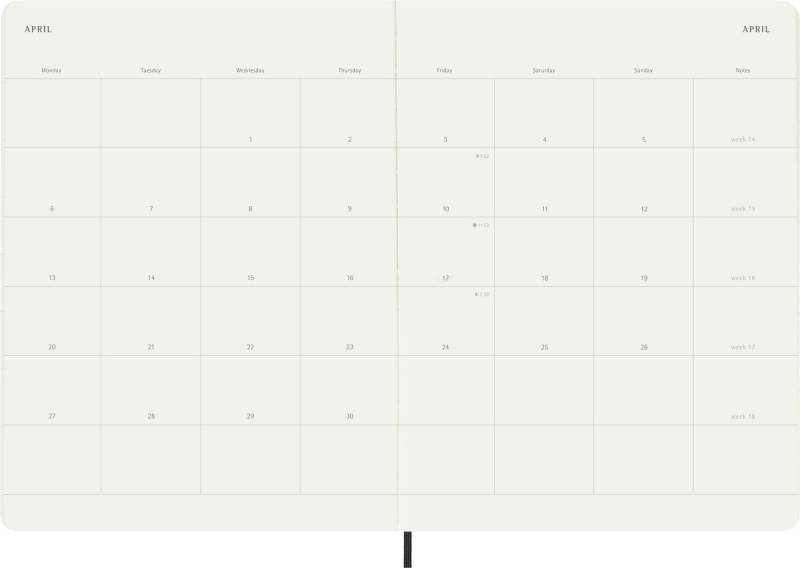 Ten planer przedstawia każdy miesiąc na dwustronicowej rozkładówce, a pomiędzy nimi znajduje się podwójna strona w linie do robienia notatek.