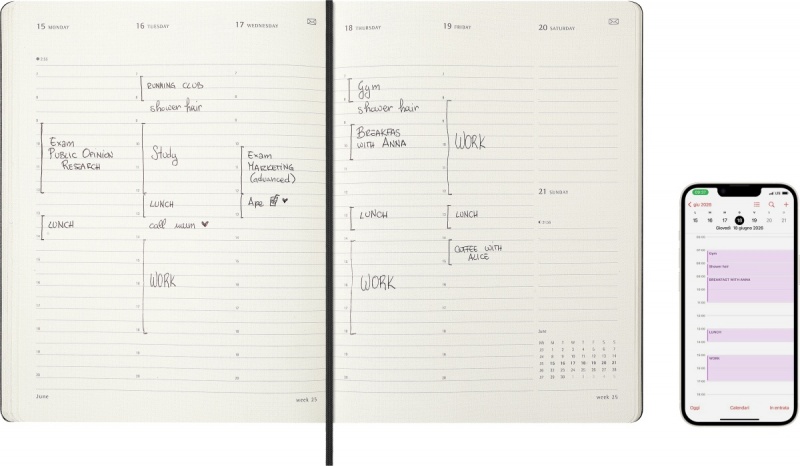 Smart Planner Pro współpracuje z piórem Smart Pen i aplikacją Notatki, aby synchronizować odręczne terminy z Twoim ulubionym kalendarzem cyfrowym. Jego uporządkowany układ stron pokazuje
