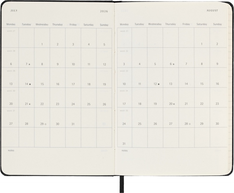18-miesięczny tygodniowy kalendarz/planer Moleskine jest datowany od lipca 2025 do grudnia 2026.