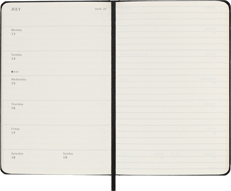 Sformatowany tak, aby po lewej stronie widniały tygodniowe spotkania, a po prawej stronie strona w linie na notatki i pomysły.