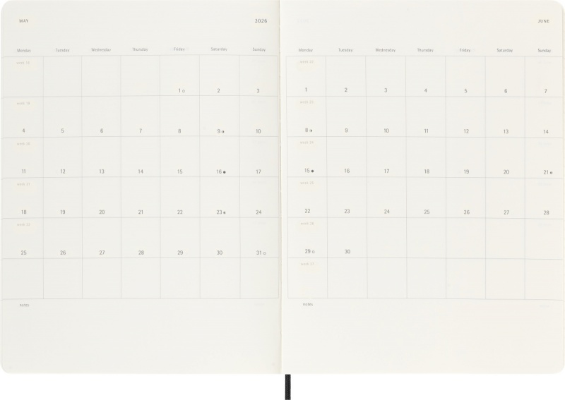 18-miesięczny tygodniowy kalendarz/planer Moleskine jest datowany od lipca 2025 do grudnia 2026.