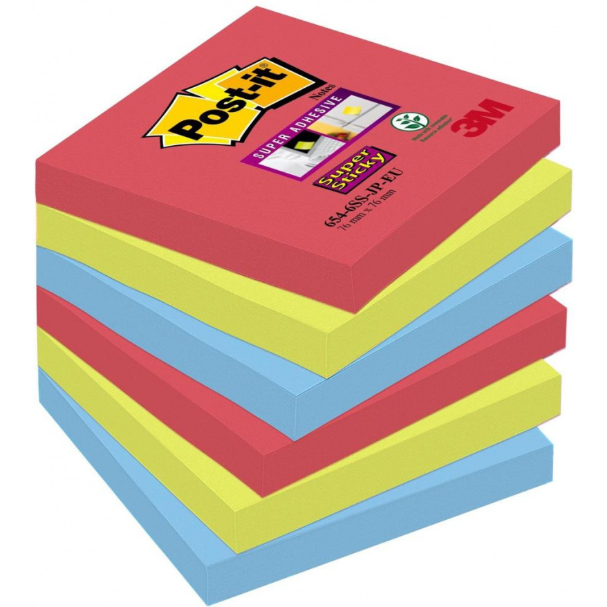 Bloczek samoprzylepny POST-IT Super Sticky (654-6SS-JP), 76x76mm, 6x90 kart., paleta Bora Bora