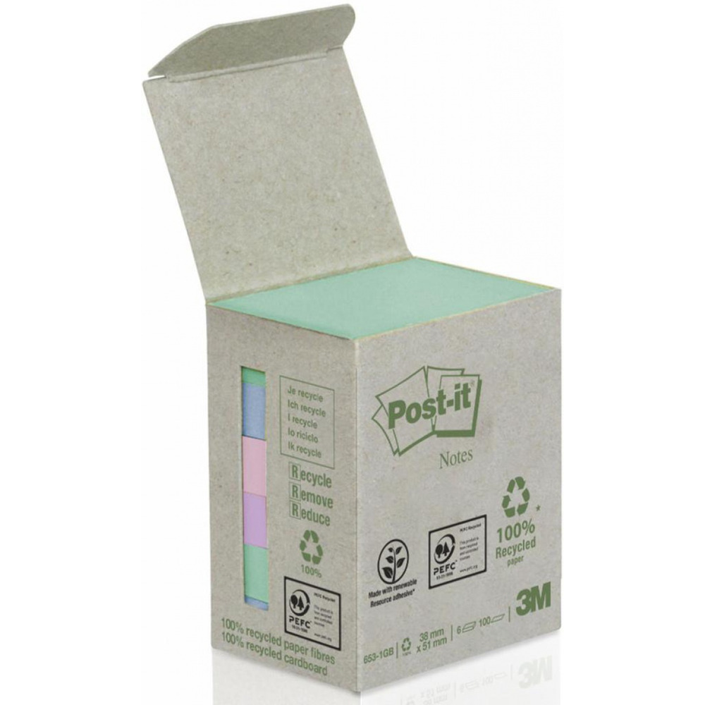 Bloczki ekologiczne POST-IT (653-1GB), 38x51mm, 6x100 kart., mix kolorów (X)