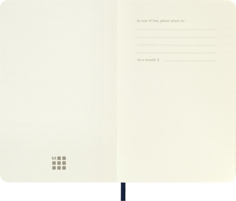 Notes Moleskine P (9x14cm) w linie, miękka oprawa, sapphire blue, 192 strony Legendarna kolekcja notesów w różnych kolorach i wielkościach znana na całym świecie. Do produkcji został użyty standardowy bezkwasowy papier certyfikowany FSC?- w kolorze kości słoniowej. Zrobiony z barwionej masy, doskonale nadaje się do zapisywania notatek długopisem oraz ołówkiem. FUNKCJE - twarda okładka - zaokrąglone rogi - elastyczne zamknięcie ? gumka pasująca do koloru okładki - zakładka ? wstążka - rozszerzalna kieszeń wewnętrzna z tektury i tkaniny - papier o gramaturze 70 g/m? w kolorze kości słoniowej ROZMIAR: P - 9 × 14 cm - 192 strony UKŁAD: - linie