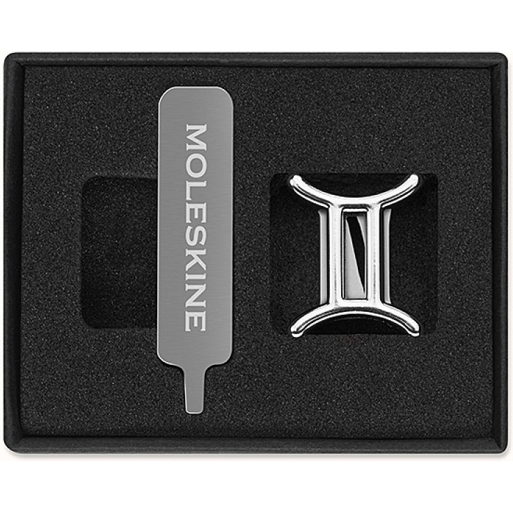 PRZYPINKA MOLESKINE BLIŹNIĘTA SREBRNA Dodaj blasku swojemu notatnikowi lub kalendarzowi, przypinając symbol zodiaku do elastycznej gumki zamknięcia. Znajdź swój znak, aby dodać wyjątkowy akcent do codziennych notatek i planów ? lub stwórz przemyślany prezent dla kogoś wyjątkowego. Wybierz biżuterię w kolorze złotym lub srebrnym i łącz ją z literami i symbolami, aby stworzyć w pełni spersonalizowany wygląd. Dostępne kolory: srebrny mat i złoty użyj dołączonej metalowej śrubki i specjalnego śrubokręta, aby przymocować przypinkę do gumki notebooka wykonanego ze stopu cynku