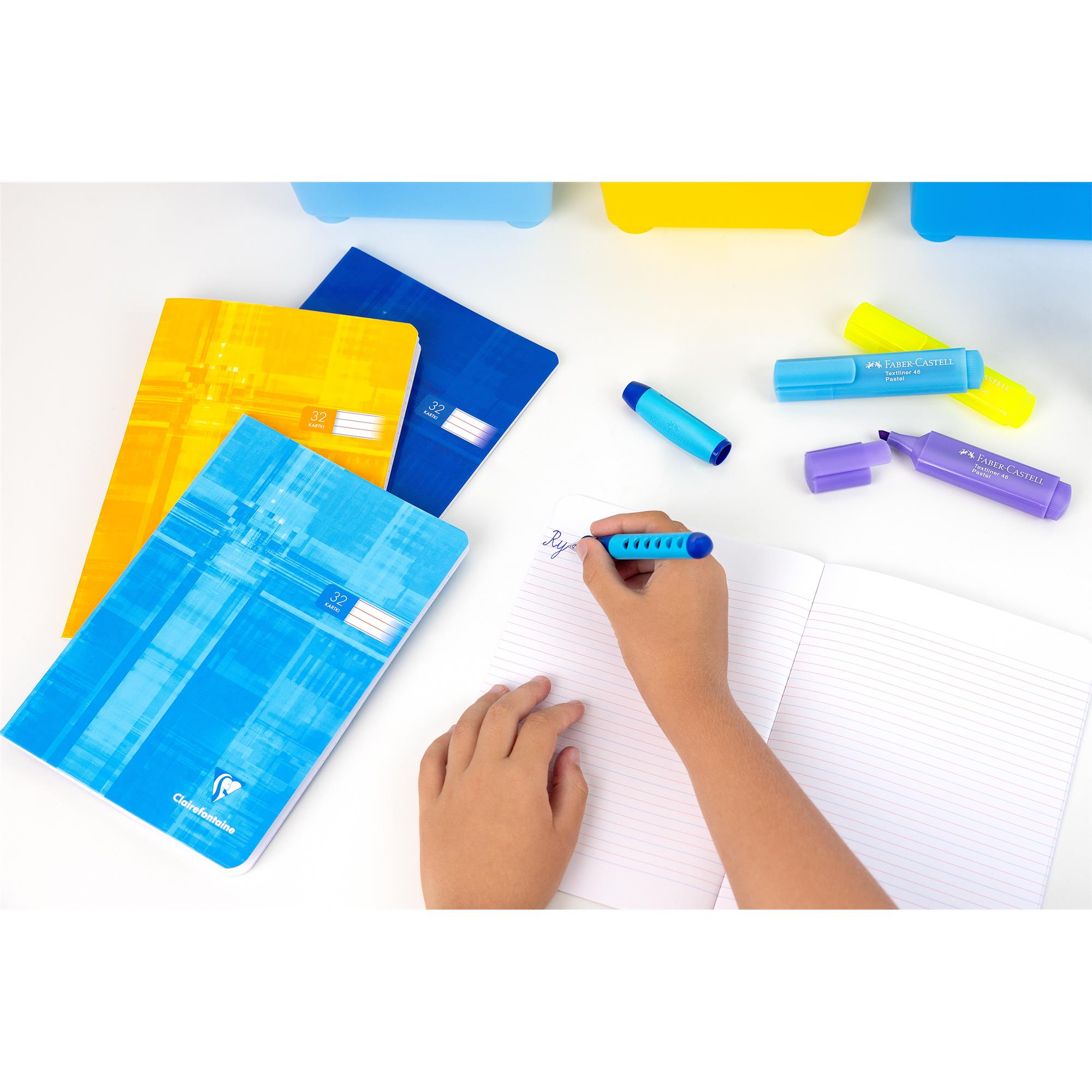 Zeszyt Clairefontaine w linię podwójną kolorową w formacie A5 z okładką w 6 intensywnych kolorach (niebieski, zielony, czerwony, błękitny, różowy, żółty). To doskonałe połączenie wyjątkowej jakości i funkcjonalności. Zawiera 32 kartki o idealnie satynowym wykończeniu, które nie tylko zapewniają doskonałą gładkość pisania, ale także eliminują prześwitywanie i przebijanie atramentu. Charakterystyczny papier Clairefontaine o gramaturze 90g/m2 gwarantuje doskonałe efekty pisania zarówno ołówkiem, długopisem jak i piórem wiecznym i atramentem. Kolor nadruku został precyzyjnie dobrany, aby zapewnić optymalny kontrast pomiędzy liniaturą a papierem, minimalizując obciążenie wzroku.