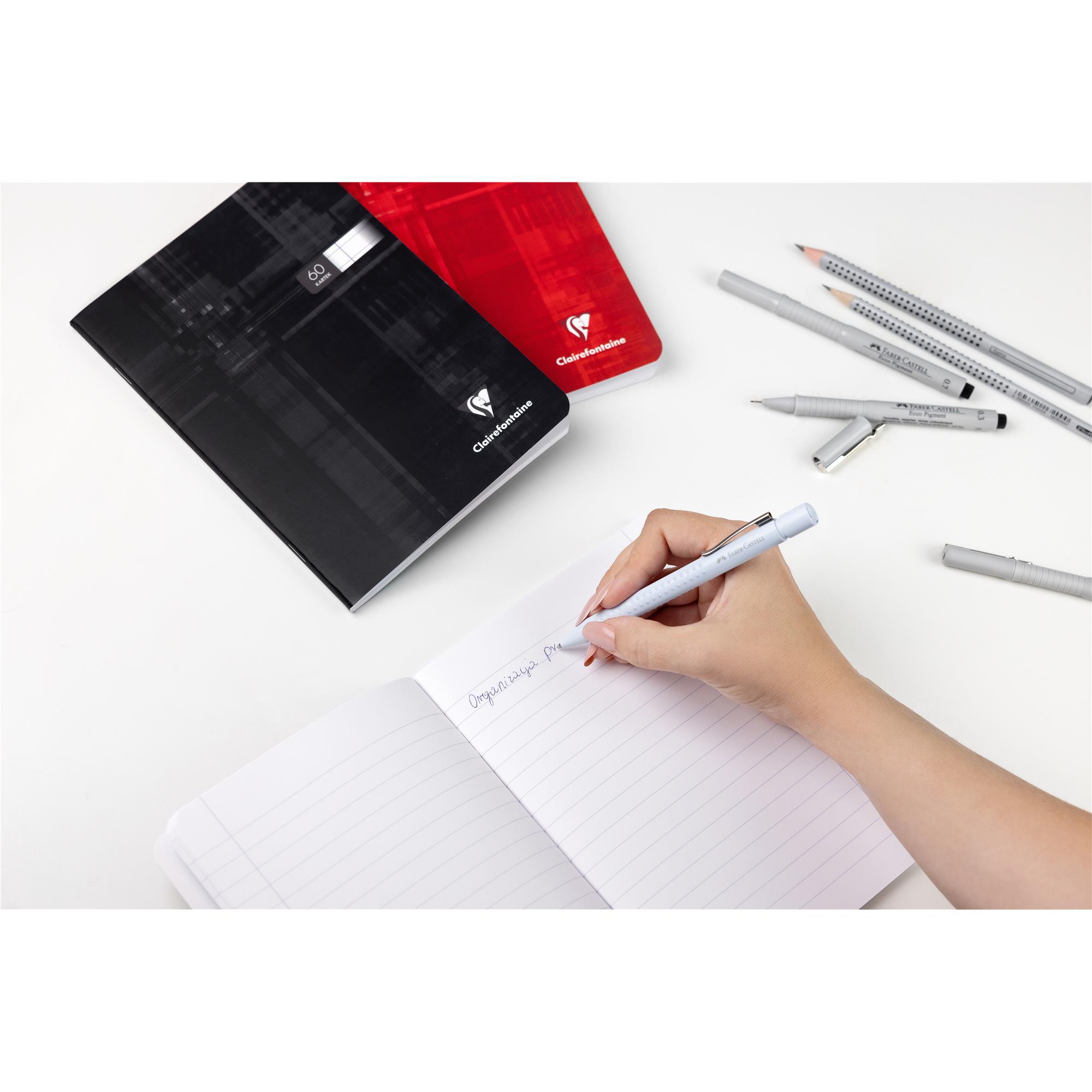 Zeszyt Clairefontaine w linie w formacie A5 z okładką w 6 intensywnych kolorach (czarny, zielony, niebieski, jasnoniebieski, różowy, czerwony). To doskonałe połączenie wyjątkowej jakości i funkcjonalności. Zawiera 60 kartek o idealnie satynowym wykończeniu, które nie tylko zapewniają doskonałą gładkość pisania, ale także eliminują prześwitywanie i przebijanie atramentu. Charakterystyczny papier Clairefontaine o gramaturze 90g/m2 gwarantuje doskonałe efekty pisania zarówno ołówkiem, długopisem jak i piórem wiecznym i atramentem. Kolor nadruku został precyzyjnie dobrany, aby zapewnić optymalny kontrast pomiędzy liniaturą a papierem, minimalizując obciążenie wzroku.