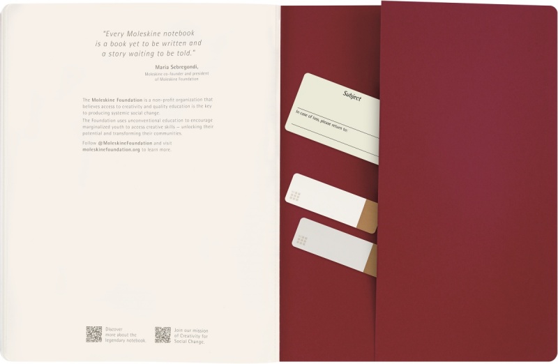 Możesz dodać kolejną warstwę do swoich notatek z zajęć za pomocą naklejek w tylnej kieszeni. Wśród nich znajdują się zakładki do identyfikacji konkretnych stron. Naklejka tematyczna z informacją Moleskine ?W razie zgubienia? pozwala spersonalizować okładkę i rozróżnić wszystkie zeszyty studenckie według tematu lub projektu.