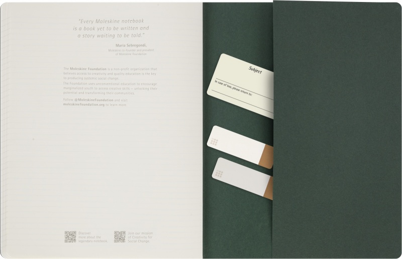 Możesz dodać kolejną warstwę do swoich notatek z zajęć za pomocą naklejek w tylnej kieszeni. Wśród nich znajdują się zakładki do identyfikacji konkretnych stron. Naklejka tematyczna z informacją Moleskine ?W razie zgubienia? pozwala spersonalizować okładkę i rozróżnić wszystkie zeszyty studenckie według tematu lub projektu.