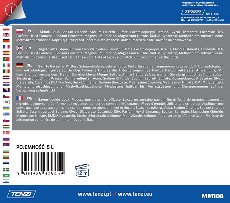 Delikatne mydło w żelu TENZI, zapach kwiatowy, Perll, 5l