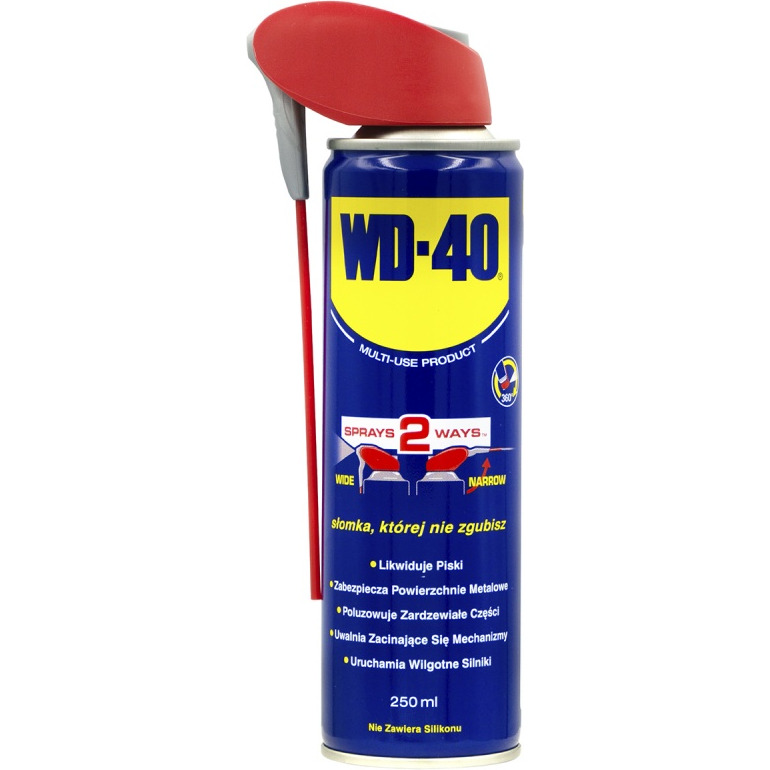 WD-40 chroni metal przed rdzą i korozją, wnika pomiędzy unieruchomione części, powoduje wypieranie wilgoci i zapewnia smarowanie niemal wszystkich rodzajów elementów