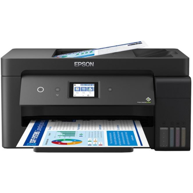 Kompaktowe urządzenie L14150 EcoTank pozwala drukować, skanować, kopiować i wysyłać faksy w rozmiarze A4, a także drukować w formacie A3+ z tylnego podajnika. Oprócz tego jego ekran LCD ułatwia drukowanie bez komputera.