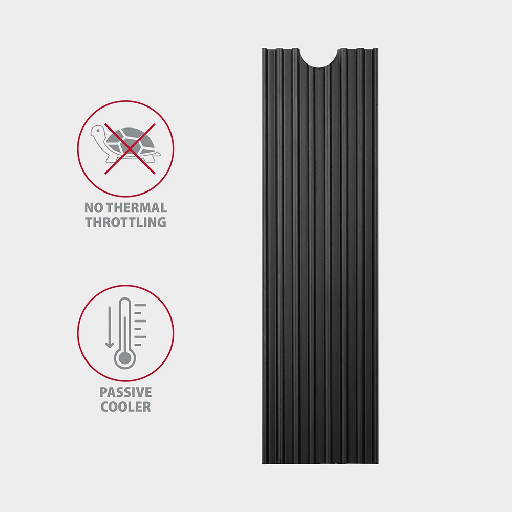3-milimetrowy żebrowany radiator aluminiowy pomaga w lepszym odprowadzaniu ciepła generowanego podczas pracy dysku SSD M.2. Zmniejsza również temperaturę dysku nawet o 15°C. Przedłuża to żywotność dysku SSD M.2 i zapobiega spowalnianiu dysku, tak zwanemu Thermal Throttling.