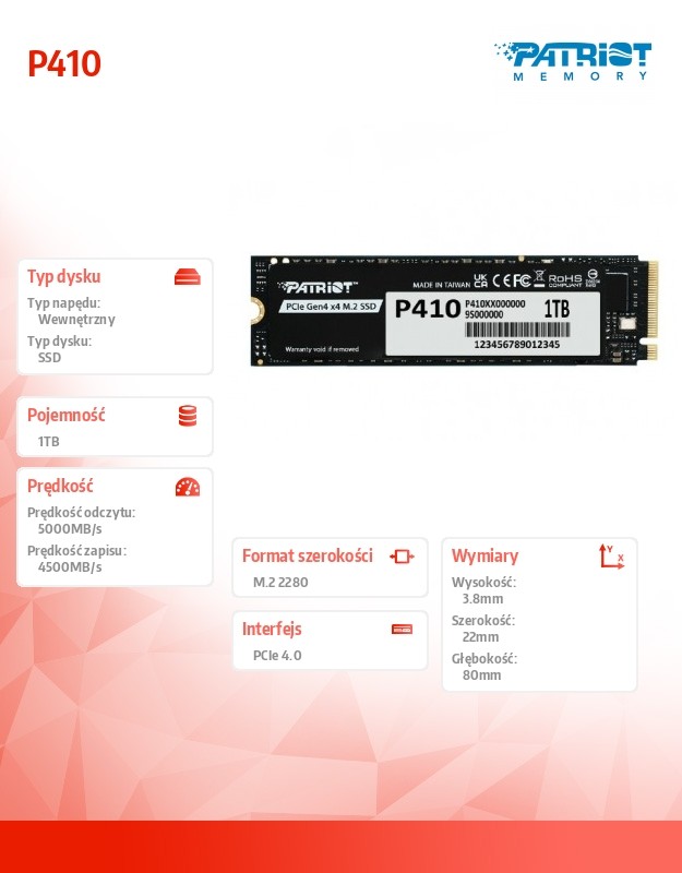 Odblokuj wysoką wydajność i niezawodną efektywność dzięki dyskowi SSD Patriot P410! Z prędkościami odczytu do 5000 MB/s i zapisu do 4500 MB/s, dysk P410 SSD jest średniej klasy dyskiem SSD gen4, który znacznie skraca czasy ładowania i zwiększa prędkość systemu. Zaprojektowany z myślą o energooszczędności, P410 SSD został stworzony tak, aby zużywać mało energii, co wydłuża żywotność baterii laptopa. Dysk P410 SSD został zaprojektowany w kompaktowej formie, aby bezproblemowo pasował do każdego popularnego PC lub laptopa, co ułatwia jego instalację i natychmiastowe użytkowanie!