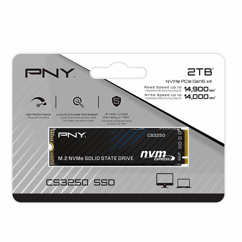 PNY CS3250 M.2 NVMe Gen5 x4 to doskonały wybór jako uniwersalny dysk SSD do modernizacji komputera stacjonarnego lub laptopa obsługującego NVMe Gen5. Interfejs NVMe Gen5 x4 zapewnia błyskawiczną wydajność, dzięki czemu jest idealnym ulepszeniem dla entuzjastów PC, graczy oraz twórców treści.