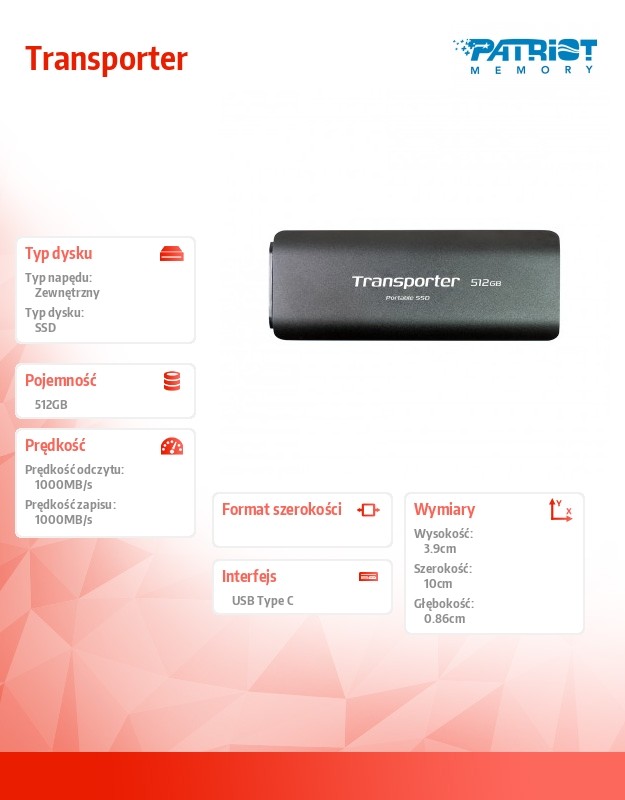 Dysk SSD 512GB Transporter 1000/1000 MB/s Type-C