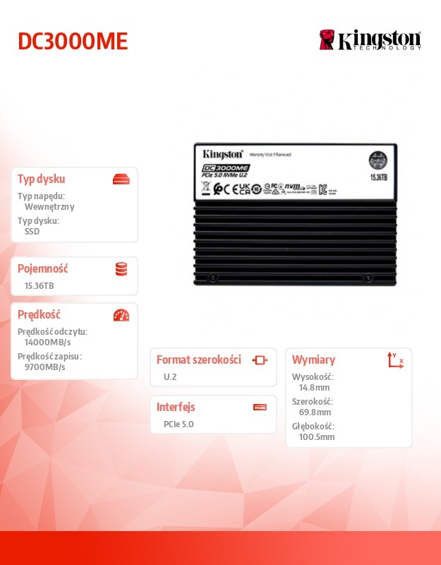 Dysk SSD Kingston DC3000ME U.2 wykorzystuje szybki interfejs PCIe 5.0 NVMe oraz pamięć 3D TLC NAND, dzięki czemu jest idealnym rozwiązaniem do zastosowań związanych z sztuczną inteligencją, obliczeniami o wysokiej wydajności (HPC), przetwarzaniem transakcji online (OLTP), aplikacjami w chmurze oraz przetwarzaniem brzegowym w serwerach NVMe czwartej i piątej generacji. Dysk DCM3000ME zaprojektowano z myślą o integratorach systemów, dużych centrach danych i dostawcach usług w chmurze. Oferuje on sprzętowe zabezpieczenie przed utratą zasilania, 256-bitowe szyfrowanie AES, obsługę protokołu TCG-Opal, niskie opóźnienia oraz stabilne parametry operacji we/wy, zapewniając niezawodność i bezpieczeństwo. Dostępne są nośniki o różnych pojemnościach - do 15,36TB.