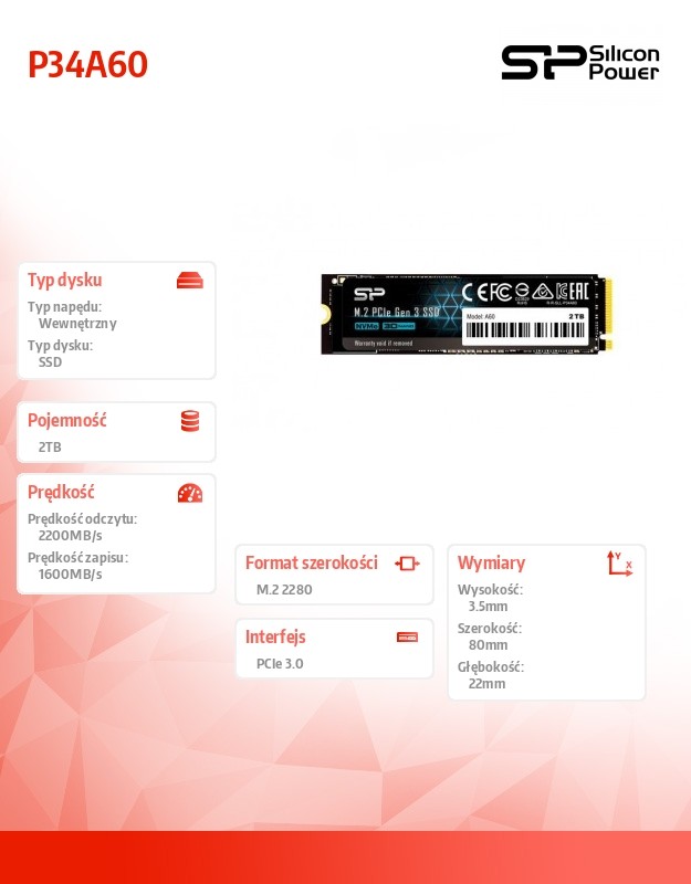 Dysk SSD P34A60 2TB PCIE M.2 NVMe 2200/1600 MB/s