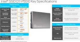 Dysk Intel SSD D7 z serii P5510 oparty jest na 144-warstwowej technologii Intel 3D NAND TLC. Oferuje on zoptymalizowaną wydajność i pojemność macierzy All Flash. Opracowany został z myślą o zwiększeniu sprawności IT i bezpieczeństwa danych. Dysk Intel SSD D7 z serii P5510 obejmuje kontroler Intel PCIe 4.0 i oprogramowanie sprzętowe, które zapewnia niskie opóźnienia, zwiększone możliwości zarządzania, skalowalność i nowe, kluczowe funkcje NVMe dla środowisk chmurowych i korporacyjnych.