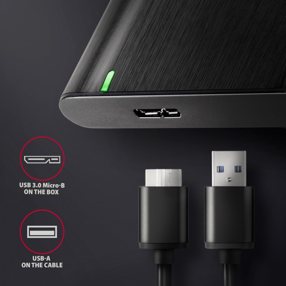Bezśrubowa aluminiowa obudowa zewnętrzna AXAGON EE25-A6M RAW box z interfejsem USB 3.2 Gen 1 (USB 3.0) przeznaczona jest dla wszystkich dysków twardych 2.5" SATA lub SSD. Złącze USB Micro-B na obudowie wraz z dołączonym kablem USB Micro-B -> USB-A umożliwia niezawodne połączenie z komputerem.