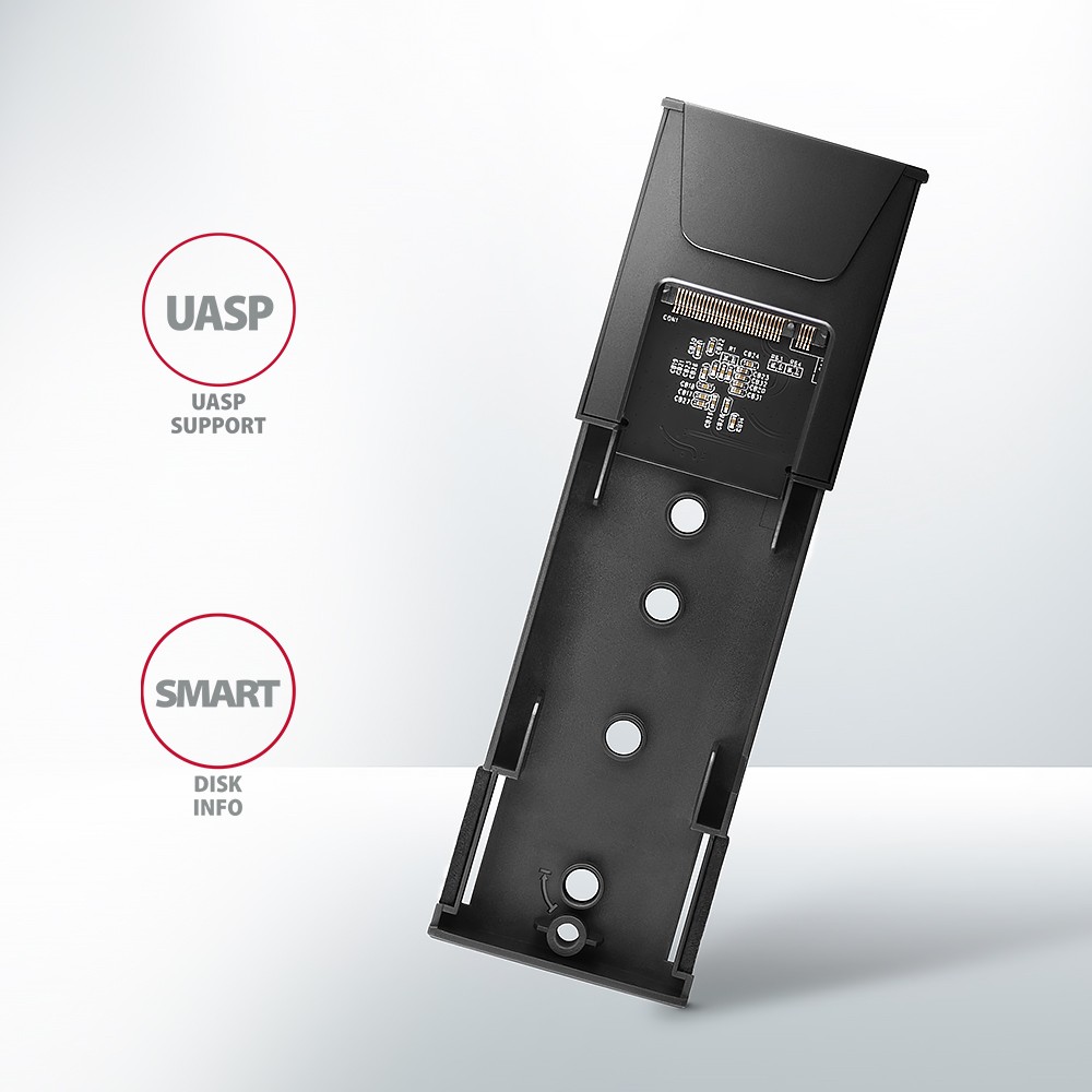 Dzięki szybkiemu interfejsowi USB 3.2 Gen 2 prędkość transmisji wynosi do 10Gb/s. Zewnętrzna obudowa M.2 obsługuje także inne nowoczesne funkcje, np. UASP, TRIM i umożliwia odczyt informacji S.M.A.R.T. monitorujących stan dysku. Obsługa trybu standby w stanie bezczynności.