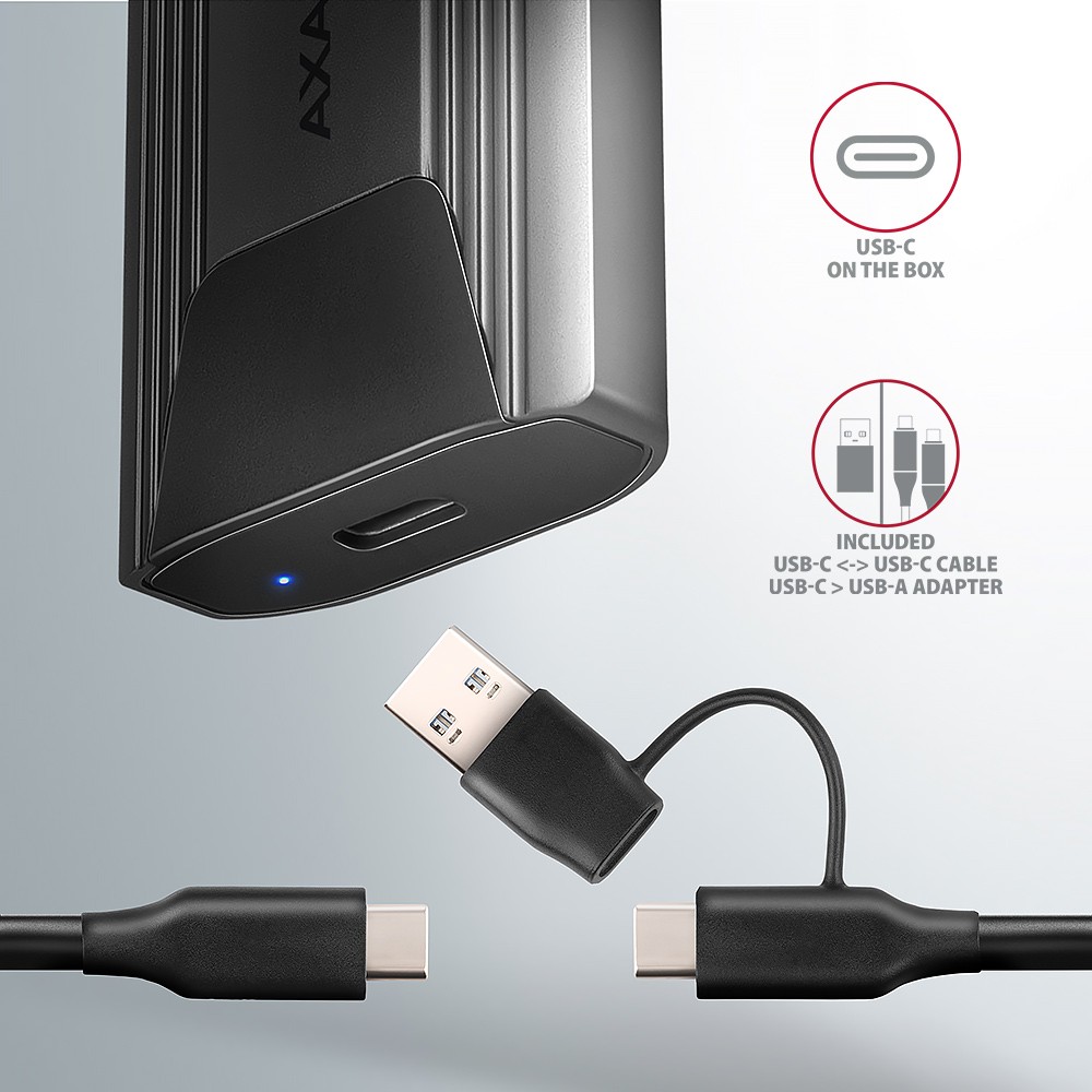 Uniwersalna zewnętrzna obudowa AXAGON EEM2-GTS2 THIN SCREWLESS box z interfejsem USB 10Gbps przeznaczona jest dla dysków M.2 NVMe lub SATA SSD. Dwustronne złącze USB-C na obudowie umożliwia niezawodne połączenie. W zestawie znajduje się nie tylko kabel USB-C -> USB-C do podłączenia obudowy do komputera, ale także adapter USB-C -> USB-A. Obudowa można podłączyć do dowolnego wolnego portu USB w notebooku.