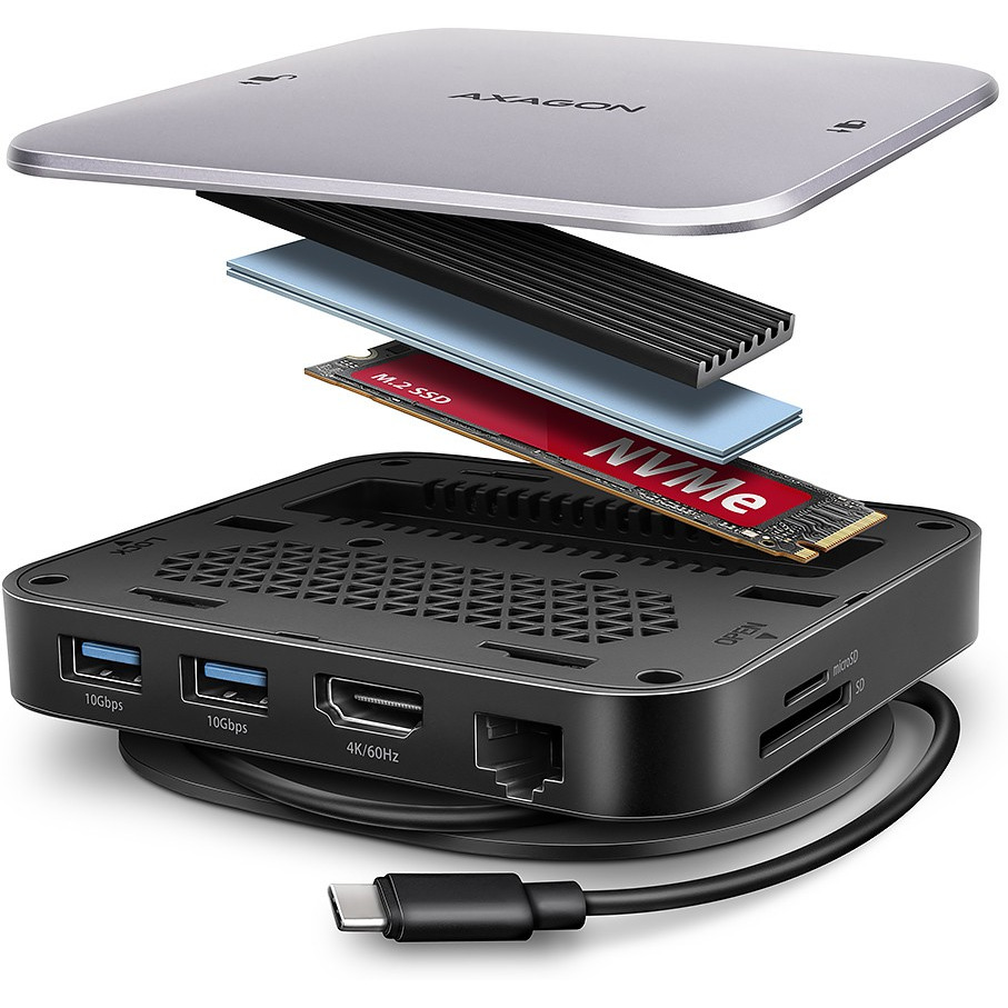 AXAGON HMC-UFO USB-C 10Gbps UFO hub rozszerza możliwości laptopa, komputera lub tabletu o osiem portów i zewnętrzną obudowę na dysk M.2. Podłącz laptopa do stacji dokującej 9w1 za pomocą dołączonego do zestawu kabla USB-C długości 65 cm. W mgnieniu oka dostaniesz do swojej dyspozycji slot na napęd NVMe lub SATA M.2, czytnik kart SD i microSD oraz złącza do podłączenia monitora, urządzeń USB, słuchawek, kabla sieciowego i zasilania Power Delivery. Kompatybilność z Thunderbolt 3/4 zapewnia również prostą i kompaktową stację dokującą dla laptopów, takich jaki Apple MacBook Air lub Pro.