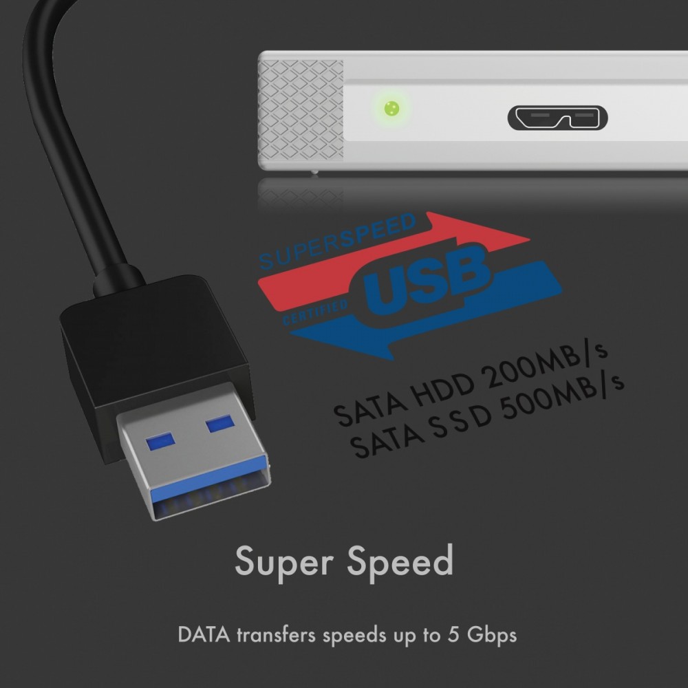 Przy pomocy interfejsu USB 3.0 transmisja danych wynosi aż do 5 Gbit / s. Dlatego praca z dużymi plikami, oglądanie filmów czy zdjęć jest szybka i wygodna! Obudowa jest kompatybilnie wsteczna z USB 2.0 a nawet 1.1.
