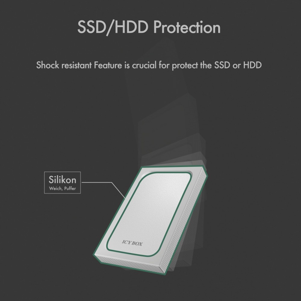 Obudowa obsługuje dyski twarde do 9,5mm wysokość, mimo tego w dalszym ciągu pozostaje smukła i elegancka. Solidna aluminiowa rama w połączeniu z powłoką silikonową sprawia, że obudowa jest odporna na zarysowania i uderzenia. Uniwersalne rozwiązanie dla każdego.