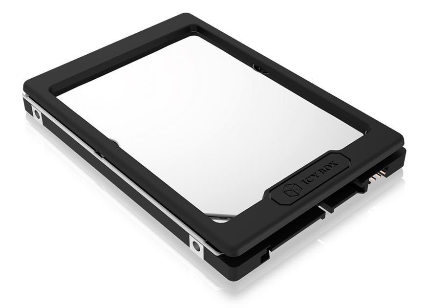 W jaki sposób można zainstalować HDD / SSD o wysokości 2,5 "z 7 mm w obudowie bezśrubowej, mobilnym stojaku lub module kasety tylnej? Potrzebujesz tylko IB-AC729! Jest on podłączony do dysku twardego lub SSD po prostu za pomocą dwóch pasków samoprzylepnych.