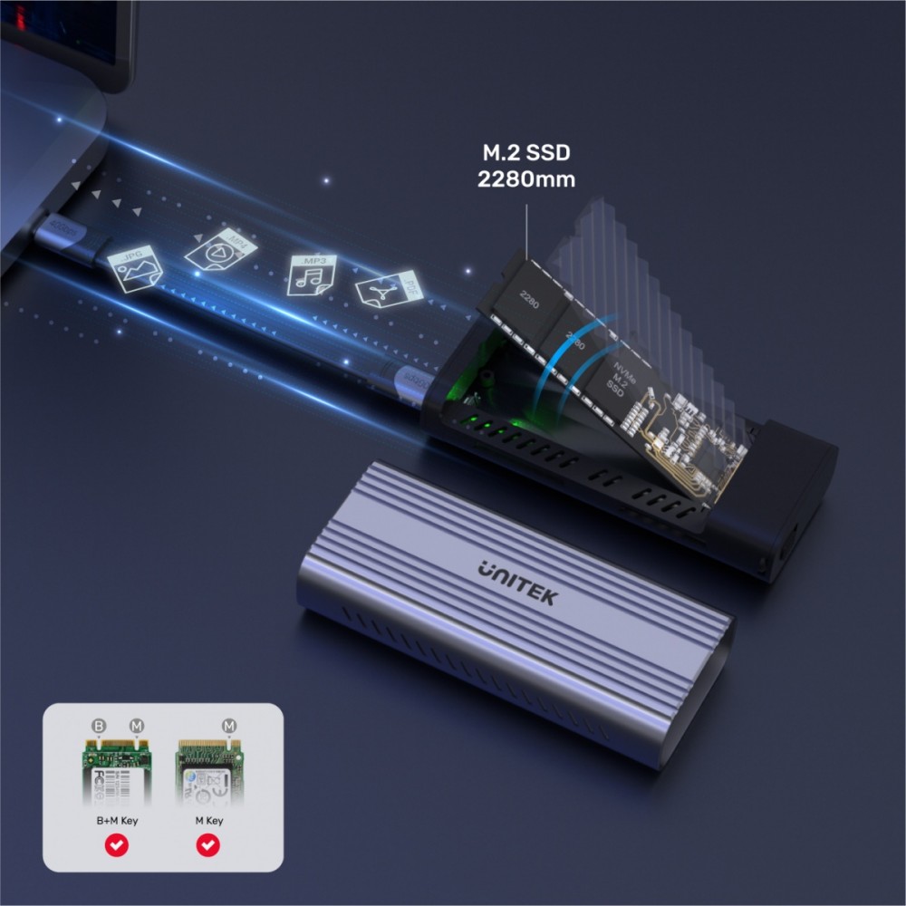 Aluminiowa obudowa kompatybilna z dyskami typu M.2 oraz interfejsem PCIe (NVMe). Idealnie pasuje do dysków z radiatorami do 12,5 mm wysokości. Do slotu pasują dyski z kluczem M key i M+B key o długości 80 mm.