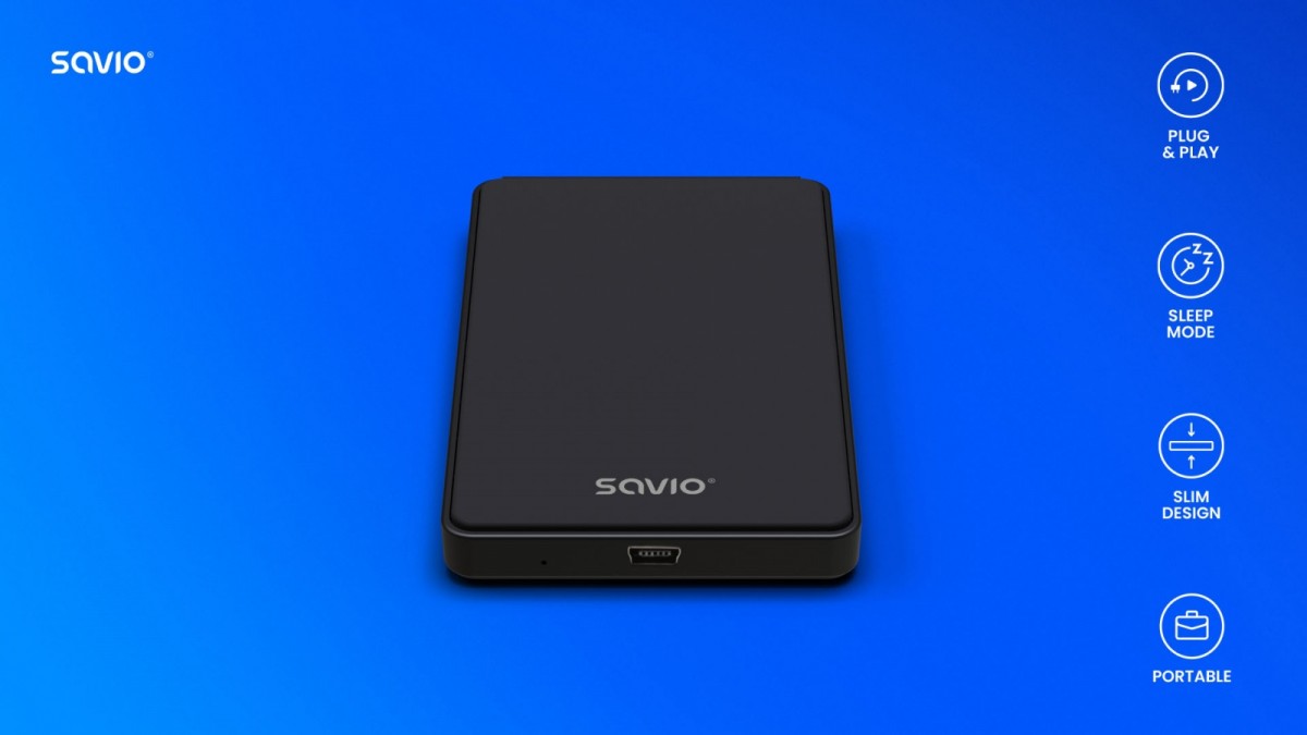 Produkt elektroniczny Savio wykonano z solidnych materiałów, które doskonale zabezpieczają dysk przed uszkodzeniami mechanicznymi, kurzem i zarysowaniami. Obudowa posiada szeroki zakres temperatur przechowywania od -20C do 50C, dzięki czemu dane będą bezpieczne w różnych warunkach atmosferycznych. Nowoczesny i elegancki design