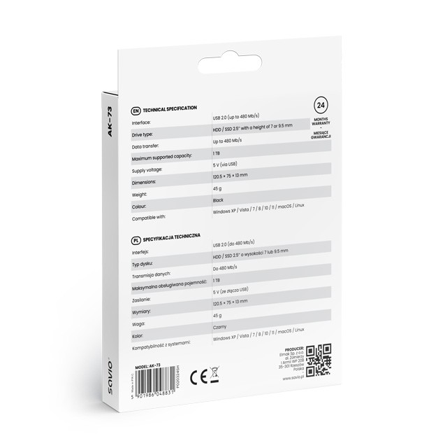 Produkt Savio obsługuje dyski HDD i SSD o rozmiarze 2,5 cala, dzięki czemu jest wszechstronna i dopasowana do większości dostępnych na rynku dysków twardych oraz półprzewodnikowych. Jest także kompatybilna z systemami: Windows XP / Vista / 7 / 8 / 10 / 11 / MacOS / Linux Interfejs USB 2.0: