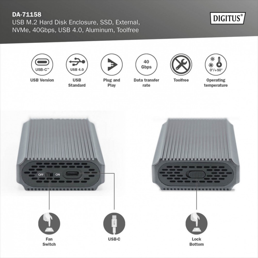 Obudowa dysku twardego USB DA-71158 dzięki szybkości transferu danych wynoszącej 40 Gb/s dla NVMe, umożliwia błyskawiczne przesyłanie plików i płynną pracę. Interfejs USB 4.0 jest wstecznie kompatybilny z USB 3.2, 3.1, 3.0, 2.0 i 1.1. Obsługuje moduły M.2 w formatach 2230, 2242, 2260 i 2280 oraz maksymalną pojemność do 8 TB. Beznarzędziowa konstrukcja zapewnia szybką i łatwą instalację za pomocą dołączonego sprzętu montażowego, a chipset ASM2464PD zapewnia niezawodną i wydajną pracę. Zintegrowany wskaźnik LED ułatwia monitorowanie stanu dysku SSD, a wytrzymała aluminiowa obudowa zapewnia doskonałe pasywne rozpraszanie ciepła. Dzięki kompaktowym wymiarom 116x60x20 mm i wadze zaledwie 150 g, obudowa jest idealna do użytku mobilnego. Obsługuje plug-and-play i jest zasilana bezpośrednio przez port USB. Obudowa jest kompatybilna z systemami Windows (11, 10, 8, 7, XP, 2004), macOS, Linux (2.4.x lub nowszy), Google Chrome OS (9.x lub nowszy), Android i iOS oraz oferuje kompleksową obsługę produktów USB-C. Szeroka kompatybilność: Obsługuje moduły M.2 w formatach 2230, 2242, 2260 i 2280, kompatybilne z szeroką gamą dysków SSD Duża pojemność: do 8 TB przestrzeni dyskowej na wszystkie pliki i dane Transfer danych na poziomie 40 Gb/s zapewnia szybkie przesyłanie plików i płynną pracę Interfejs USB 4.0: Najnowsza technologia USB z kompatybilnością wsteczną z USB 3.2, 3.1, 3.0, 2.0 i 1.1 Plug and play: wystarczy podłączyć przez USB i od razu rozpocząć pracę. Obsługa wielu platform: zgodność z systemami Windows, macOS, Linux, Google Chrome OS, Android i iOS Chipset ASM2464PD zapewniający niezawodną i wydajną pracę Zintegrowany wskaźnik LED do monitorowania stanu dysku SSD Trwała aluminiowa obudowa z pasywnym odprowadzaniem ciepła Przenośna konstrukcja: Kompaktowa i lekka o wymiarach 116x60x20 mm i wadze zaledwie 150 g