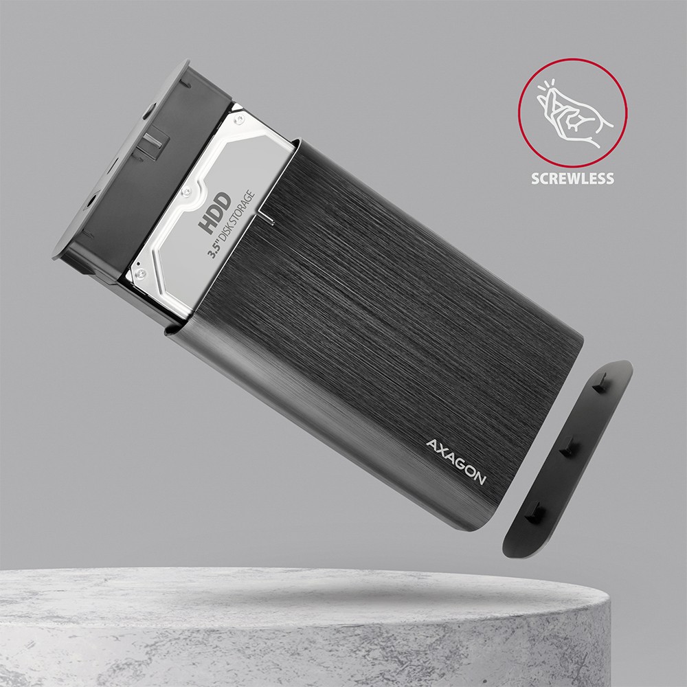 Bezśrubowe otwieranie obudowy ułatwia montaż i demontaż dysku 3.5" HDD. Wewnętrzna ramka pudełka została zaprojektowana tak, aby pomieścić mniejsze 2.5" dyski HDD/SSD, jednocześnie chroniąc włożony dysk. Wymiana dysków jest szybka i łatwa, co rozszerza możliwości wykorzystania skrzynki, np. do migracji danych.