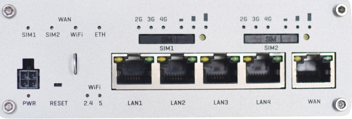 Porty we/wy (sieciówka drobna): 5 x 10/100/1000 Mbit/s, 2 x Slot karty SIM, 1 x USB 2.0