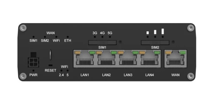 Porty we/wy (sieciówka drobna): 2 x Slot karty SIM, 1 x WAN (RJ-45), 4 x 10/100/1000 Mbit/s