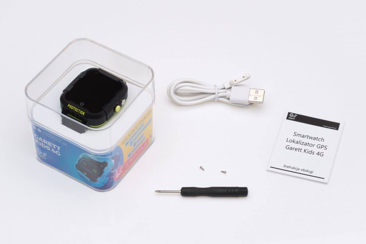 Akcesoria w zestawie: Smartwatch Garett Kids 4G Kabel magnetyczny USB c Śrubokręt Instrukcja obsługi Karta gwarancyjna