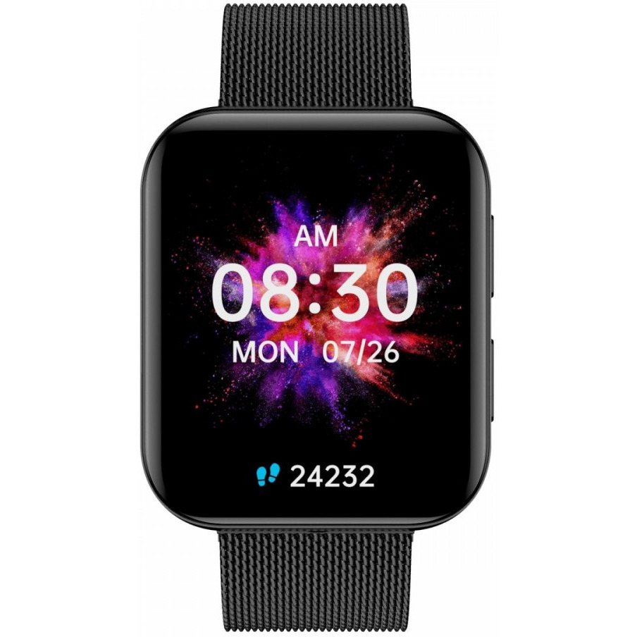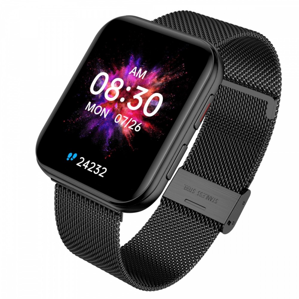 Funkcje: Wodoodporność IP68 Przystosowany do pływania Dotykowy ekran Podświetlany ekran Bluetooth Kompatybilność z Android Kompatybilność z iOS Aplikacja z opcją GPS Powiadomienia wibracyjne Powiadomienia o wiadomościach SMS Powiadomienia o połączeniach Powiadomienia z aplikacji Odbieranie, odrzucanie, wykonywanie połączeń Klawiatura wybierania numerów Wykonywanie zdjęć telefonem Sterowanie odtwarzaniem muzyki z telefonu Funkcja szukania telefonu Funkcja szukania urządzenia Alarm rozładowania Pulsometr Ciśnieniomierz Pulsoksymetr Rodzaj trybów sportowych: 100 Trybów m. in.: Bieganie, Bieżnia, Trampolina, Joga, Koszykówka, Piłka nożna, Badminton, Maraton, Jazda na rolkach, Hula-hop, Golf, Baseball, Taniec, Pilates, Sztuki walki Krokomierz Monitor braku aktywności Przypomnienia o nawodnieniu Monitor snu Informacje pogodowe Wybudzenie ekranu ruchem ręki Odtworzenie pokonanej trasy Odtwarzacz muzyczny Stoper Minutnik Budzik Różne tarcze do wyboru Metalowy pasek Pasek wymienny Dedykowana aplikacja: Smart-Time Pro